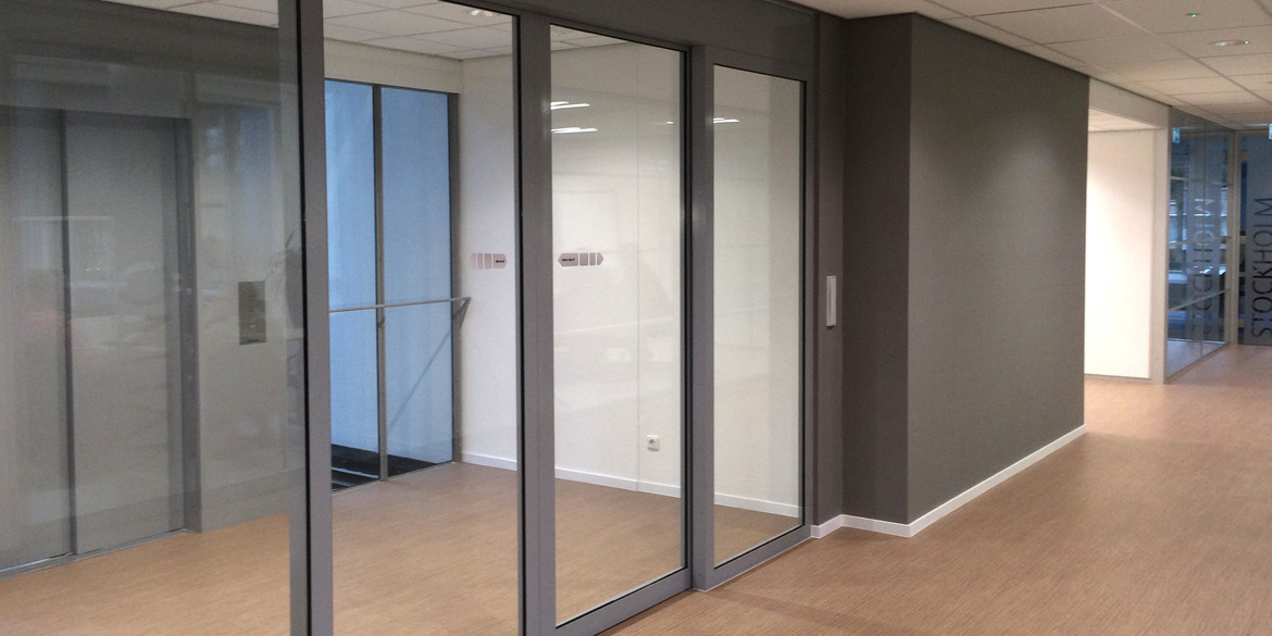 The top of the door leaf has an anodized aluminium rail, the bottom of the door is supported in a simple ‘U’ section floor guide, this gives an uninterrupted glass finish to the system. This system is ideally suited to internal applications particularly in office developments.